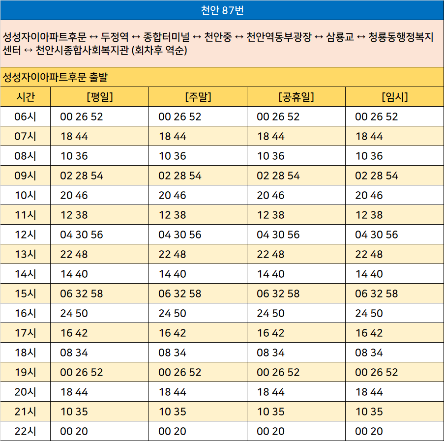 천안 87번: 성성자이아파트후문 ↔ 두정역 ↔ 종합터미널 ↔ 천안중 ↔ 천안역동부광장 ↔ 삼룡교 ↔ 청룡동행정복지센터 ↔ 천안시종합사회복지관 (회차후 역순)