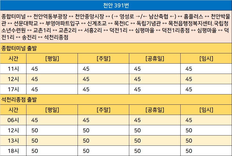 천안 391번: 종합터미널 ↔ 천안역동부광장 ↔ 천안중앙시장 ↔ (→ 영성로 →/← 남산축협 ←) ↔ 홈플러스 ↔ 천안박물관 ↔ 선문대학교 ↔ 부영아파트입구 ↔ 신계초교 ↔ 목천IC ↔ 독립기념관 ↔ 목천읍행정복지센터.국립청소년수련원 ↔ 교촌1리 ↔ 교촌2리 ↔ 서흥2리 ↔ 덕전1리 ↔ 심평마을 ↔ 덕전1리종점 ↔ 심평마을 ↔ 덕전1리 ↔ 송전리 ↔ 석천리종점