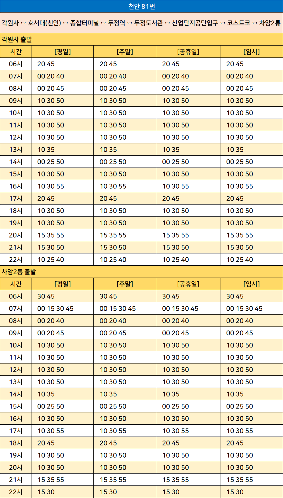 천안 81번: 각원사 ↔ 호서대(천안) ↔ 종합터미널 ↔ 두정역 ↔ 두정도서관 ↔ 산업단지공단입구 ↔ 코스트코 ↔ 차암2통