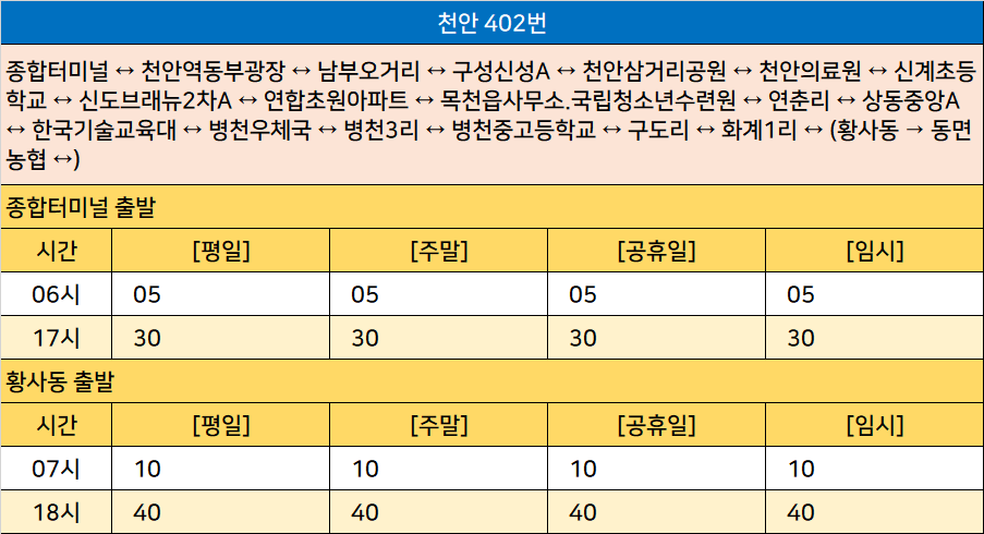 천안 402번: 종합터미널 ↔ 천안역동부광장 ↔ 남부오거리 ↔ 구성신성A ↔ 천안삼거리공원 ↔ 천안의료원 ↔ 신계초등학교 ↔ 신도브래뉴2차A ↔ 연합초원아파트 ↔ 목천읍사무소.국립청소년수련원 ↔ 연춘리 ↔ 상동중앙A ↔ 한국기술교육대 ↔ 병천우체국 ↔ 병천3리 ↔ 병천중고등학교 ↔ 구도리 ↔ 화계1리 ↔ (황사동 → 동면농협 ↔)