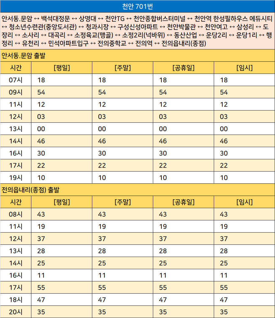 천안 701번: 안서동.문암 ↔ 백석대정문 ↔ 상명대 ↔ 천안TG ↔ 천안종합버스터미널 ↔ 천안역 한성필하우스 에듀시티 ↔ 청소년수련관(중앙도서관) ↔ 청과시장 ↔ 구성신성아파트 ↔ 천안박물관 ↔ 천안여고 ↔ 삼성리 ↔ 도장리 ↔ 소사리 ↔ 대곡리 ↔ 소정육교(맹골) ↔ 소정2리(넉바위) ↔ 동산산업 ↔ 운당2리 ↔ 운당1리 ↔ 행정리 ↔ 유천리 ↔ 민석아파트입구 ↔ 전의중학교 ↔ 전의역 ↔ 전의읍내리(종점)