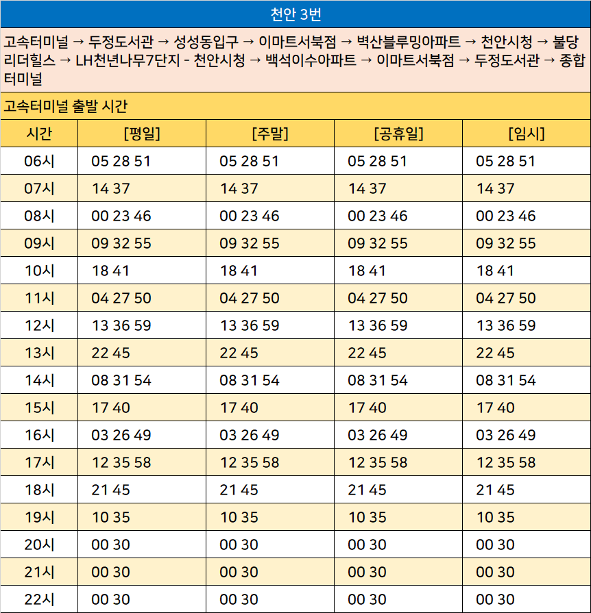 천안 3번: 고속터미널 → 두정도서관 → 성성동입구 → 이마트서북점 → 벽산블루밍아파트 → 천안시청 → 불당리더힐스 → LH천년나무7단지 - 천안시청 → 백석이수아파트 → 이마트서북점 → 두정도서관 → 종합터미널