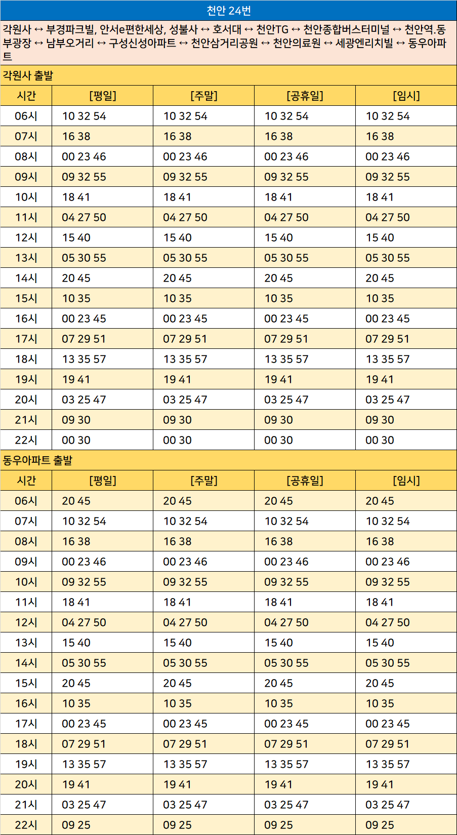 천안 24번: 각원사 ↔ 부경파크빌, 안서e편한세상, 성불사 ↔ 호서대 ↔ 천안TG ↔ 천안종합버스터미널 ↔ 천안역.동부광장 ↔ 남부오거리 ↔ 구성신성아파트 ↔ 천안삼거리공원 ↔ 천안의료원 ↔ 세광엔리치빌 ↔ 동우아파트