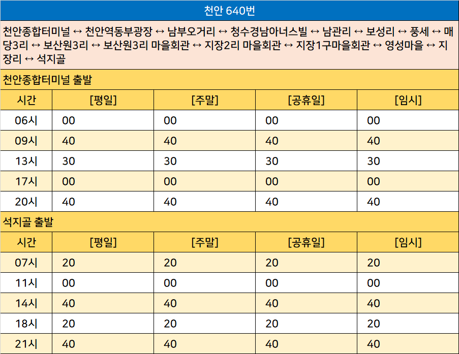 천안 640번: 천안종합터미널 ↔ 천안역동부광장 ↔ 남부오거리 ↔ 청수경남아너스빌 ↔ 남관리 ↔ 보성리 ↔ 풍세 ↔ 매당3리 ↔ 보산원3리 ↔ 보산원3리 마을회관 ↔ 지장2리 마을회관 ↔ 지장1구마을회관 ↔ 영성마을 ↔ 지장리 ↔ 석지골