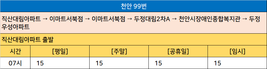천안 99번: 직산대림아파트 → 이마트서북점 → 이마트서북점 → 두정대림2차A → 천안시장애인종합복지관 → 두정우성아파트