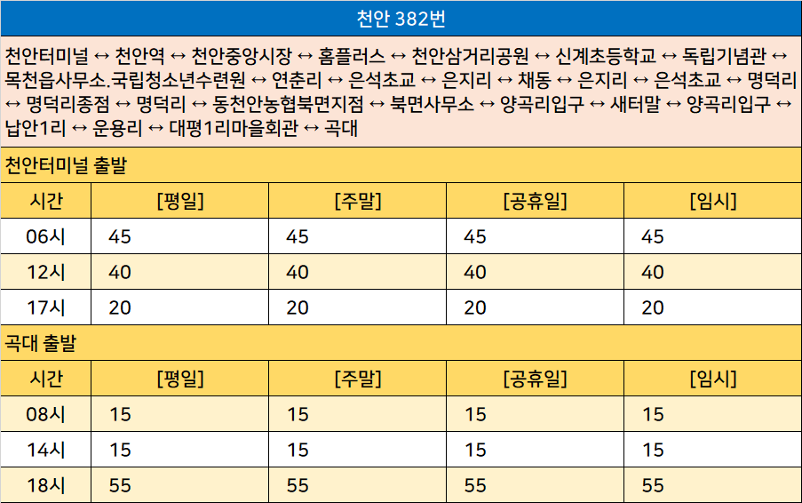 천안 382번: 천안종합터미널 ↔ 천안역 ↔ 천안중앙시장 ↔ 홈플러스 ↔ 천안삼거리공원 ↔ 신계초등학교 ↔ 독립기념관 ↔ 목천읍사무소.국립청소년수련원 ↔ 연춘리 ↔ 은석초교 ↔ 은지리 ↔ 채동 ↔ 은지리 ↔ 은석초교 ↔ 명덕리 ↔ 명덕리종점 ↔ 명덕리 ↔ 동천안농협북면지점 ↔ 북면사무소 ↔ 양곡리입구 ↔ 새터말 ↔ 양곡리입구 ↔ 납안1리 ↔ 운용리 ↔ 대평1리마을회관 ↔ 곡대