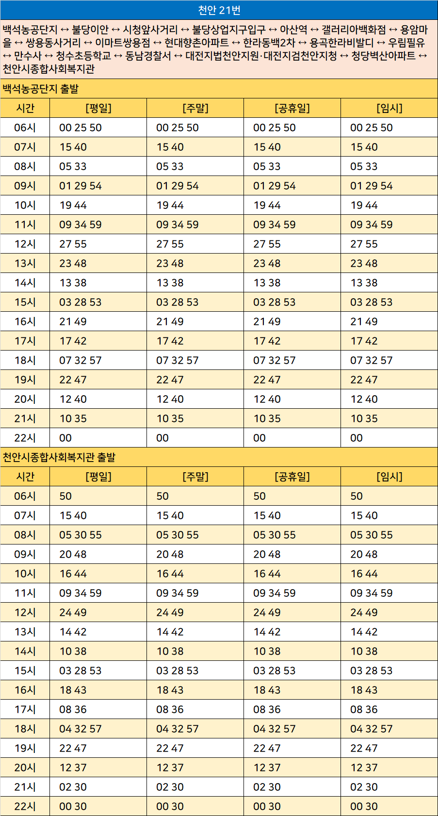 천안 21번: 백석농공단지 ↔ 불당이안 ↔ 시청앞사거리 ↔ 불당상업지구입구 ↔ 아산역 ↔ 갤러리아백화점 ↔ 용암마을 ↔ 쌍용동사거리 ↔ 이마트쌍용점 ↔ 현대향촌아파트 ↔ 한라동백2차 ↔ 용곡한라비발디 ↔ 우림필유 ↔ 만수사 ↔ 청수초등학교 ↔ 동남경찰서 ↔ 대전지법천안지원·대전지검천안지청 ↔ 청당벽산아파트 ↔ 천안시종합사회복지관