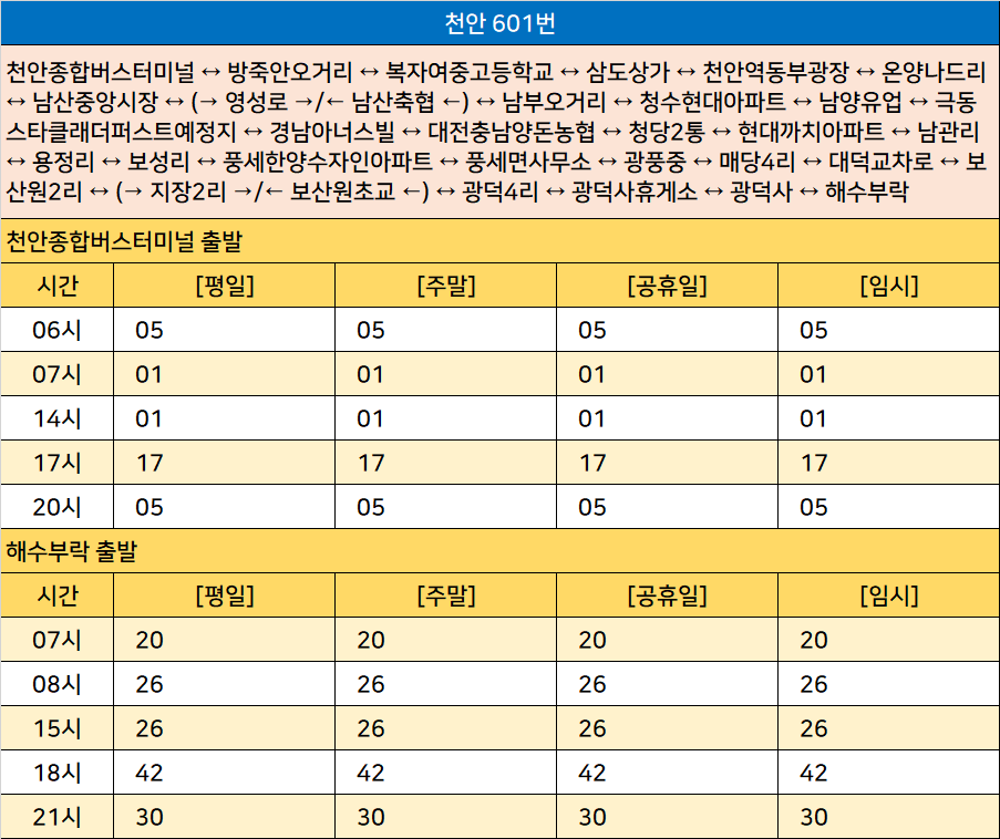 천안 601번: 천안종합버스터미널 ↔ 방죽안오거리 ↔ 복자여중고등학교 ↔ 삼도상가 ↔ 천안역동부광장 ↔ 온양나드리 ↔ 남산중앙시장 ↔ (→ 영성로 →/← 남산축협 ←) ↔ 남부오거리 ↔ 청수현대아파트 ↔ 남양유업 ↔ 극동스타클래더퍼스트예정지 ↔ 경남아너스빌 ↔ 대전충남양돈농협 ↔ 청당2통 ↔ 현대까치아파트 ↔ 남관리 ↔ 용정리 ↔ 보성리 ↔ 풍세한양수자인아파트 ↔ 풍세면사무소 ↔ 광풍중 ↔ 매당4리 ↔ 대덕교차로 ↔ 보산원2리 ↔ (→ 지장2리 →/← 보산원초교 ←) ↔ 광덕4리 ↔ 광덕사휴게소 ↔ 광덕사 ↔ 해수부락