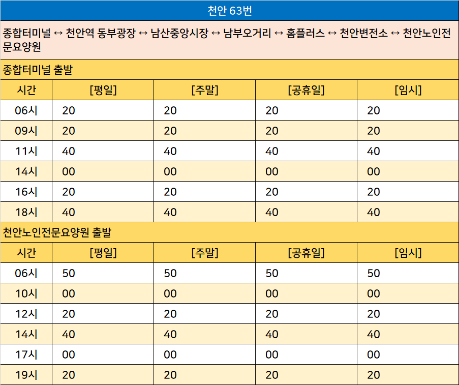 천안 63번: 종합터미널 ↔ 천안역 동부광장 ↔ 남산중앙시장 ↔ 남부오거리 ↔ 홈플러스 ↔ 천안변전소 ↔ 천안노인전문요양원