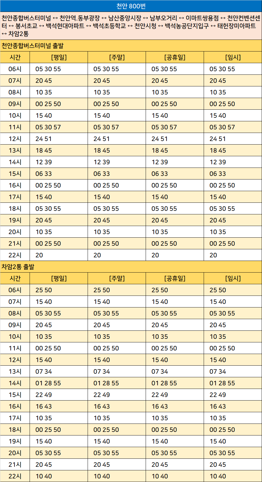 천안 800번: 천안종합버스터미널 ↔ 천안역.동부광장 ↔ 남산중앙시장 ↔ 남부오거리 ↔ 이마트쌍용점 ↔ 천안컨벤션센터 ↔ 봉서초교 ↔ 백석현대아파트 ↔ 백석초등학교 ↔ 천안시청 ↔ 백석농공단지입구 ↔ 태헌장미아파트 ↔ 차암2통