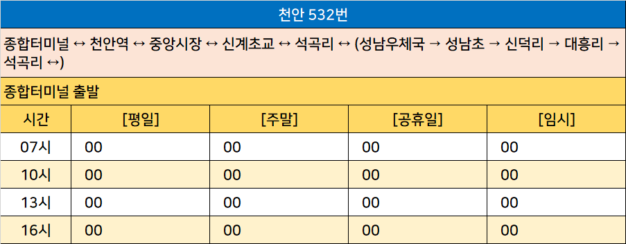 천안 532번: 종합터미널 ↔ 천안역 ↔ 중앙시장 ↔ 신계초교 ↔ 석곡리 ↔ (성남우체국 → 성남초 → 신덕리 → 대흥리 → 석곡리 ↔)