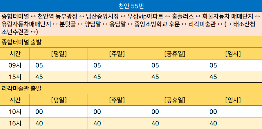 천안 55번: 종합터미널 ↔ 천안역 동부광장 ↔ 남산중앙시장 ↔ 우성vip아파트 ↔ 홈플러스 ↔ 화물자동차 매매단지 ↔ 유랑자동차매매단지 ↔ 분텃골 ↔ 양담말 ↔ 응담말 ↔ 중앙소방학교 후문 ↔ 리각미술관 ↔ (→ 태조산청소년수련관 ↔)