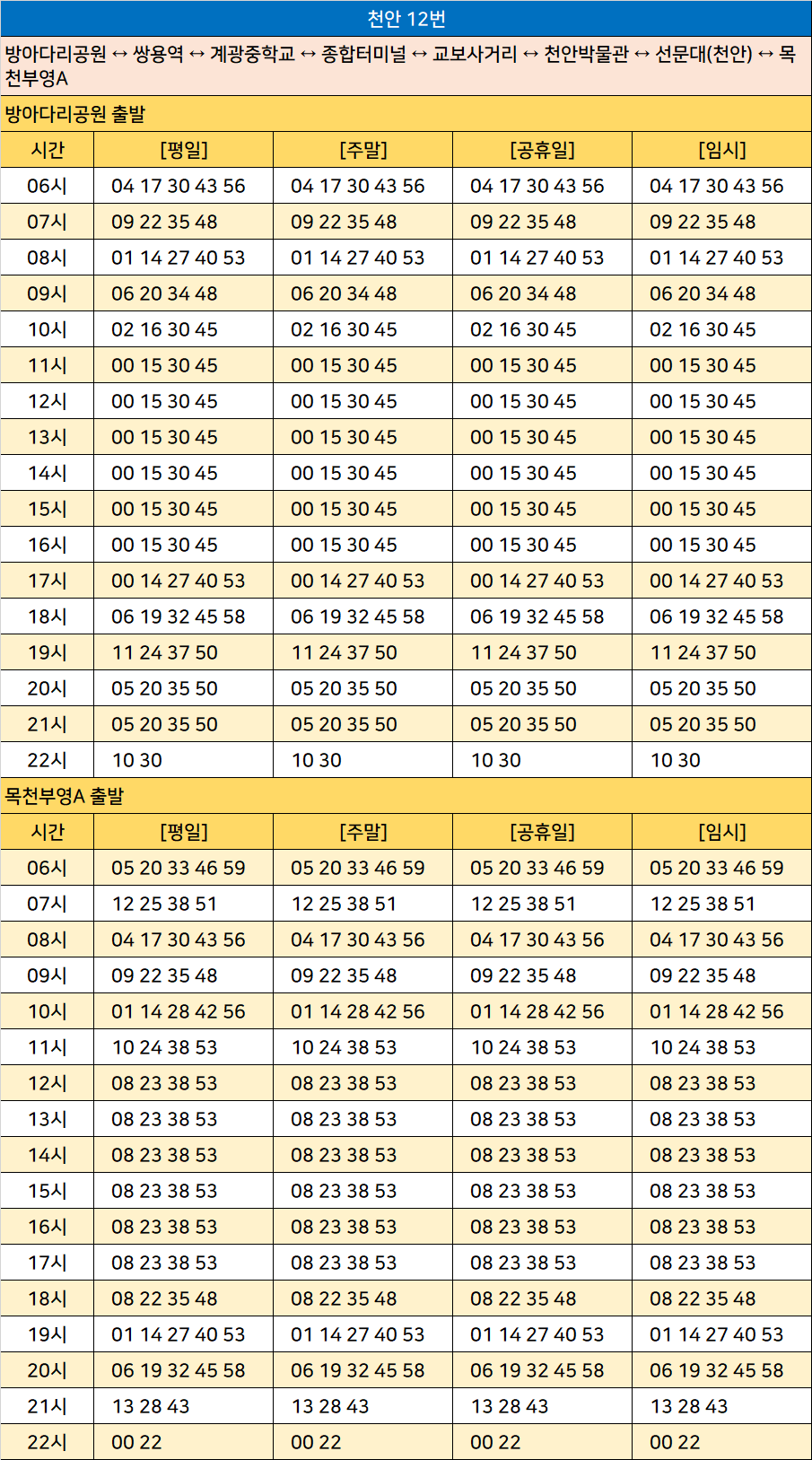천안 12번: 방아다리공원 ↔ 쌍용역 ↔ 계광중학교 ↔ 종합터미널 ↔ 교보사거리 ↔ 천안박물관 ↔ 선문대(천안) ↔ 목천부영A