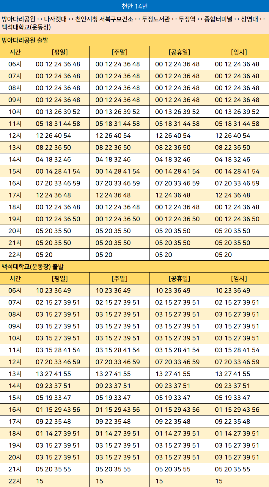 천안 14번: 방아다리공원 ↔ 나사렛대 ↔ 천안시청 서북구보건소 ↔ 두정도서관 ↔ 두정역 ↔ 종합터미널 ↔ 상명대 ↔ 백석대학교(운동장)