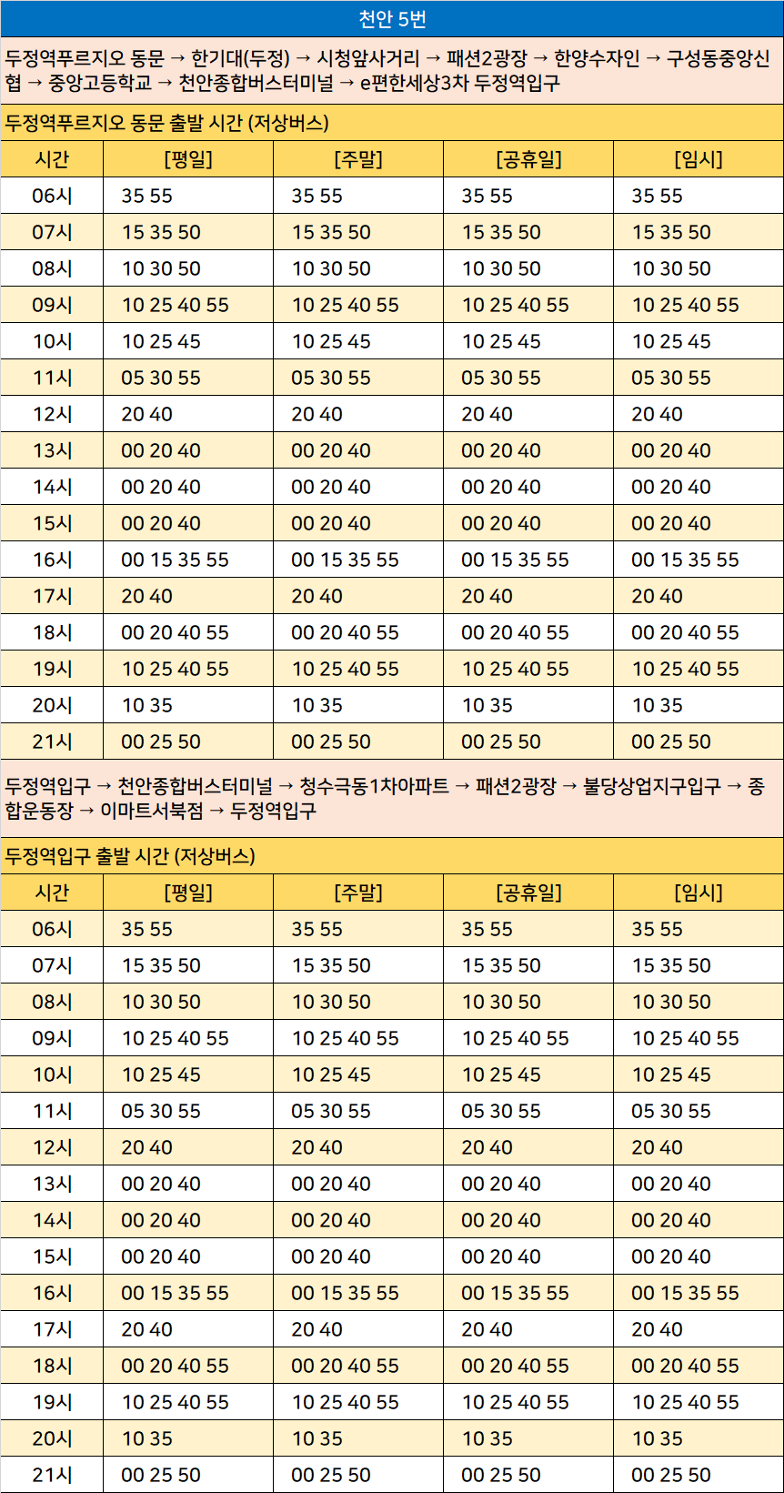 천안 5번: 두정역입구 → 천안종합버스터미널 → 청수극동1차아파트 → 패션2광장 → 불당상업지구입구 → 종합운동장 → 이마트서북점 → 두정역입구 / 두정역푸르지오 동문 → 한기대(두정) → 시청앞사거리 → 패션2광장 → 한양수자인 → 구성동중앙신협 → 중앙고등학교 → 천안종합버스터미널 → e편한세상3차 두정역입구