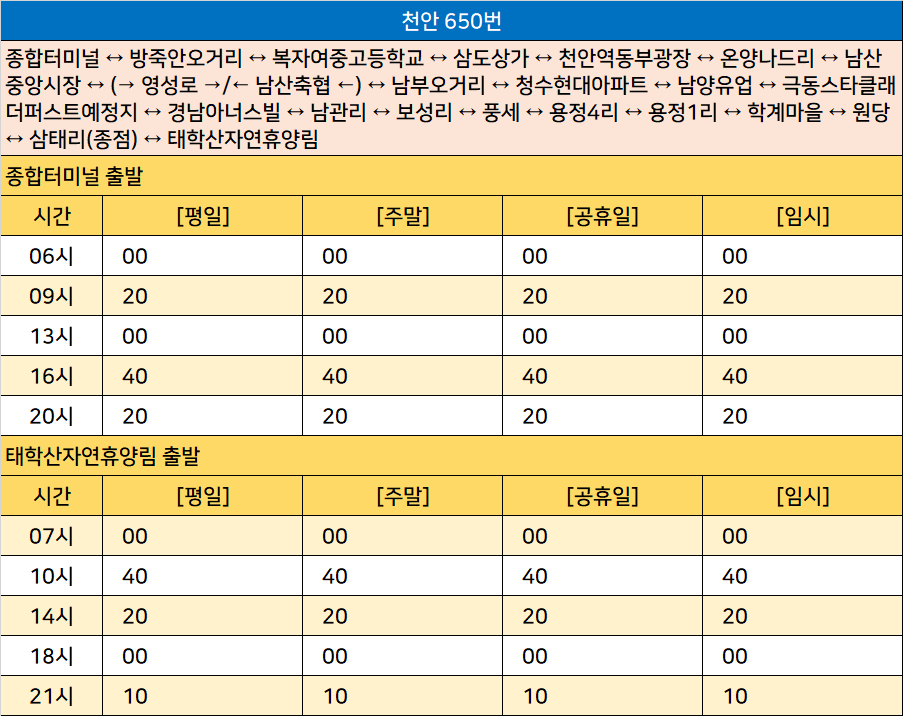 천안 650번: 종합터미널 ↔ 방죽안오거리 ↔ 복자여중고등학교 ↔ 삼도상가 ↔ 천안역동부광장 ↔ 온양나드리 ↔ 남산중앙시장 ↔ (→ 영성로 →/← 남산축협 ←) ↔ 남부오거리 ↔ 청수현대아파트 ↔ 남양유업 ↔ 극동스타클래더퍼스트예정지 ↔ 경남아너스빌 ↔ 남관리 ↔ 보성리 ↔ 풍세 ↔ 용정4리 ↔ 용정1리 ↔ 학계마을 ↔ 원당 ↔ 삼태리(종점) ↔ 태학산자연휴양림