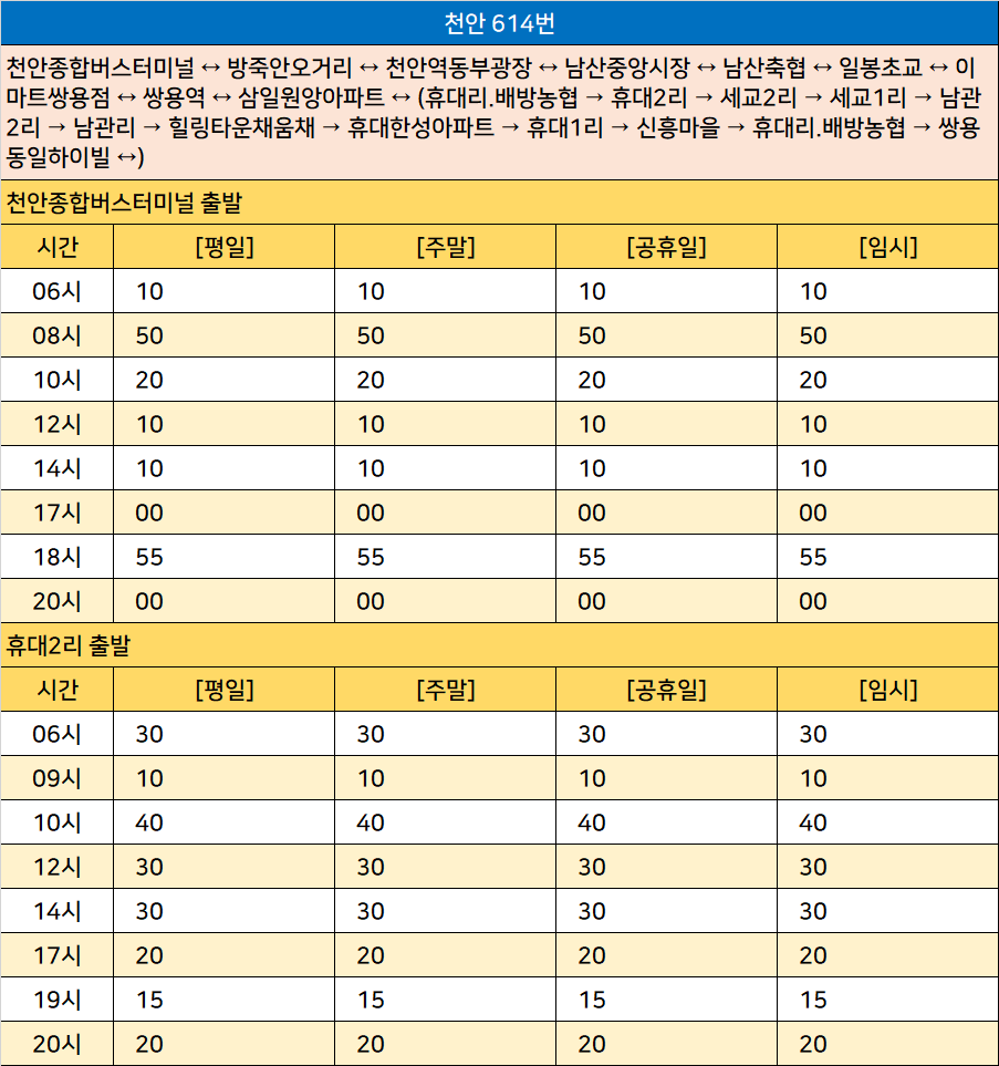 천안 614번: 천안종합버스터미널 ↔ 방죽안오거리 ↔ 천안역동부광장 ↔ 남산중앙시장 ↔ 남산축협 ↔ 일봉초교 ↔ 이마트쌍용점 ↔ 쌍용역 ↔ 삼일원앙아파트 ↔ (휴대리.배방농협 → 휴대2리 → 세교2리 → 세교1리 → 남관2리 → 남관리 → 힐링타운채움채 → 휴대한성아파트 → 휴대1리 → 신흥마을 → 휴대리.배방농협 → 쌍용동일하이빌 ↔)