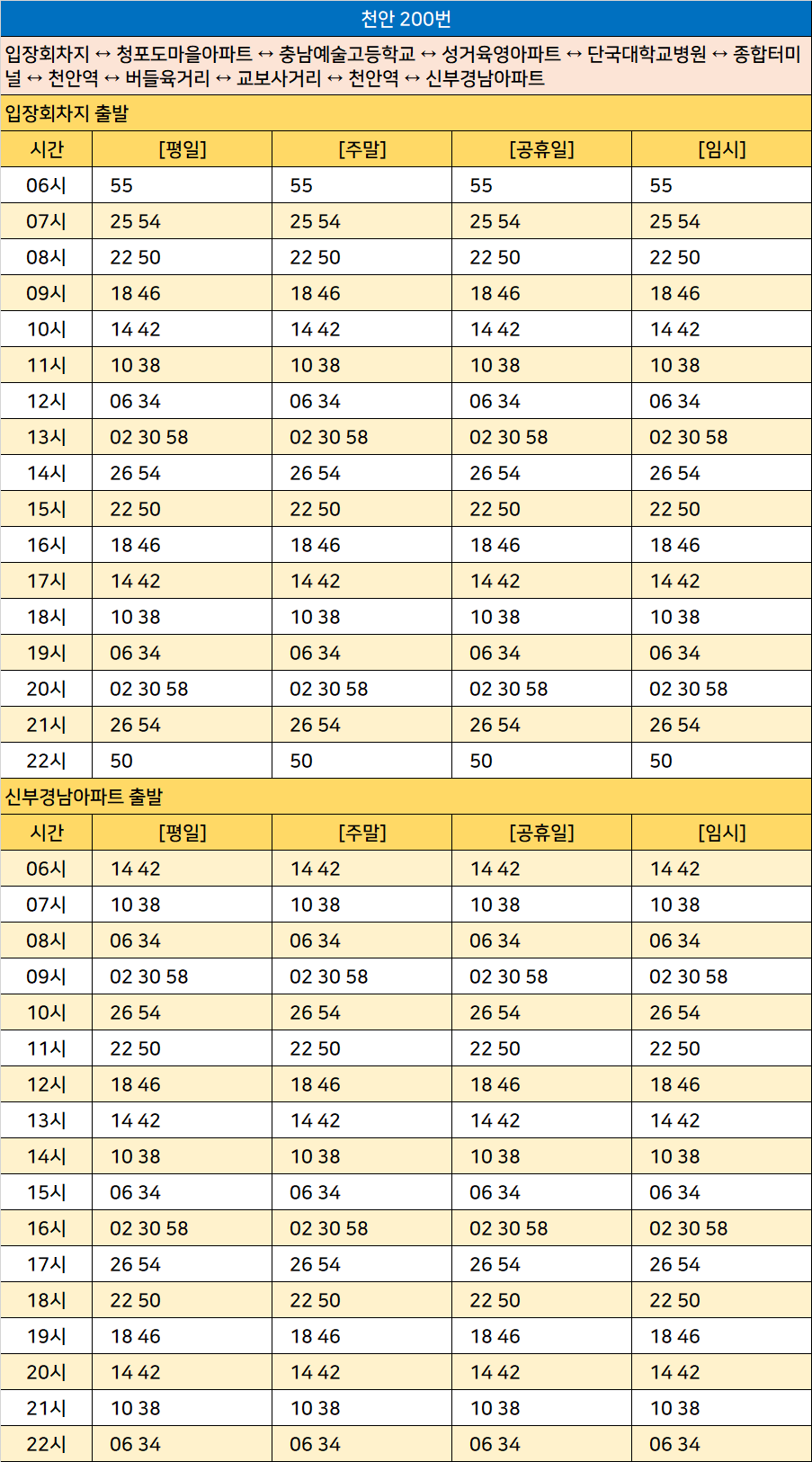 천안 200번: 입장회차지 ↔ 청포도마을아파트 ↔ 충남예술고등학교 ↔ 성거육영아파트 ↔ 단국대학교병원 ↔ 종합터미널 ↔ 천안역 ↔ 버들육거리 ↔ 교보사거리 ↔ 천안역 ↔ 신부경남아파트