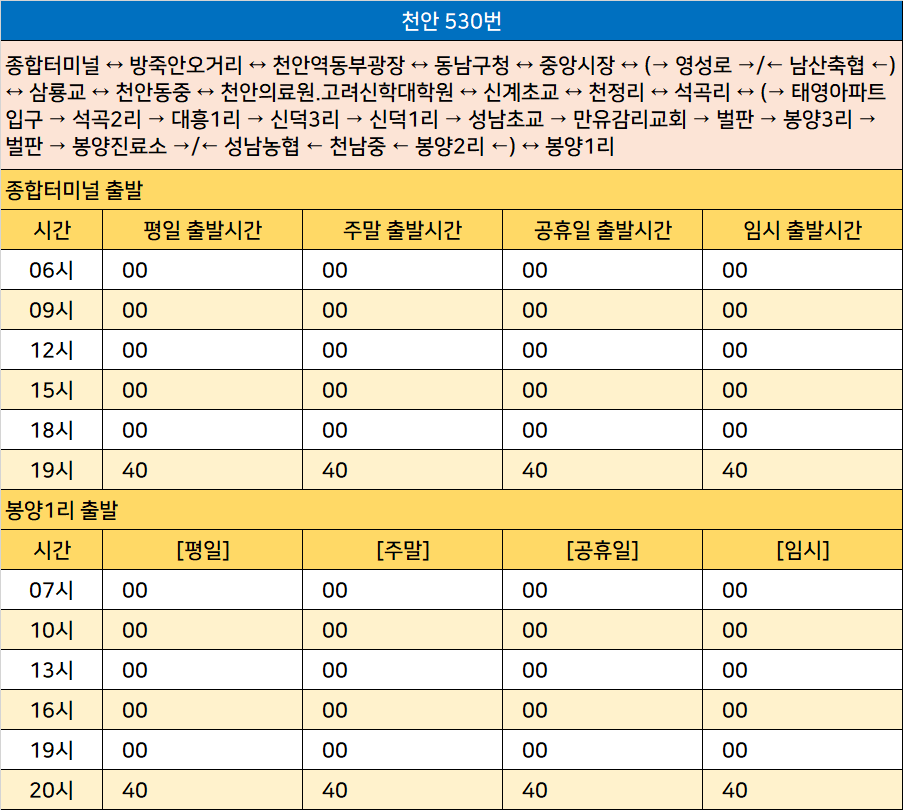 천안 530번: 종합터미널 ↔ 방죽안오거리 ↔ 천안역동부광장 ↔ 동남구청 ↔ 중앙시장 ↔ (→ 영성로 →/← 남산축협 ←) ↔ 삼룡교 ↔ 천안동중 ↔ 천안의료원.고려신학대학원 ↔ 신계초교 ↔ 천정리 ↔ 석곡리 ↔ (→ 태영아파트입구 → 석곡2리 → 대흥1리 → 신덕3리 → 신덕1리 → 성남초교 → 만유감리교회 → 벌판 → 봉양3리 → 벌판 → 봉양진료소 →/← 성남농협 ← 천남중 ← 봉양2리 ←) ↔ 봉양1리