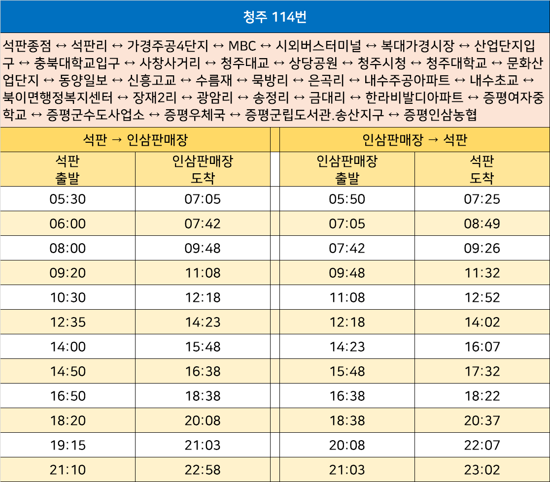 청주 114번: 석판종점 ↔ 석판리 ↔ 가경주공4단지 ↔ MBC ↔ 시외버스터미널 ↔ 복대가경시장 ↔ 산업단지입구 ↔ 충북대학교입구 ↔ 사창사거리 ↔ 청주대교 ↔ 상당공원 ↔ 청주시청 ↔ 청주대학교 ↔ 문화산업단지 ↔ 동양일보 ↔ 신흥고교 ↔ 수름재 ↔ 묵방리 ↔ 은곡리 ↔ 내수주공아파트 ↔ 내수초교 ↔ 북이면행정복지센터 ↔ 장재2리 ↔ 광암리 ↔ 송정리 ↔ 금대리 ↔ 한라비발디아파트 ↔ 증평여자중학교 ↔ 증평군수도사업소 ↔ 증평우체국 ↔ 증평군립도서관.송산지구 ↔ 증평인삼농협