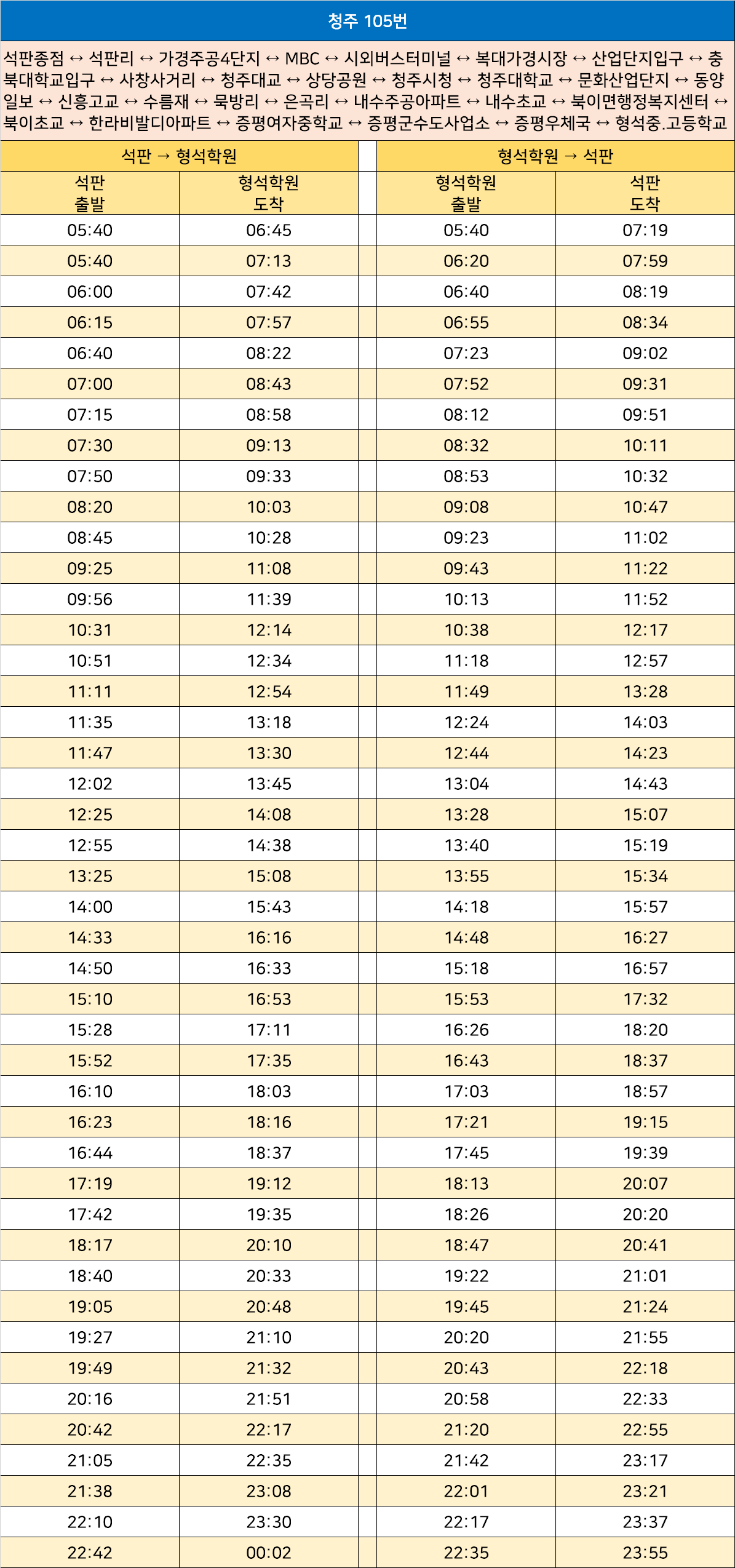 청주 105번: 석판종점 ↔ 석판리 ↔ 가경주공4단지 ↔ MBC ↔ 시외버스터미널 ↔ 복대가경시장 ↔ 산업단지입구 ↔ 충북대학교입구 ↔ 사창사거리 ↔ 청주대교 ↔ 상당공원 ↔ 청주시청 ↔ 청주대학교 ↔ 문화산업단지 ↔ 동양일보 ↔ 신흥고교 ↔ 수름재 ↔ 묵방리 ↔ 은곡리 ↔ 내수주공아파트 ↔ 내수초교 ↔ 북이면행정복지센터 ↔ 북이초교 ↔ 한라비발디아파트 ↔ 증평여자중학교 ↔ 증평군수도사업소 ↔ 증평우체국 ↔ 형석중.고등학교