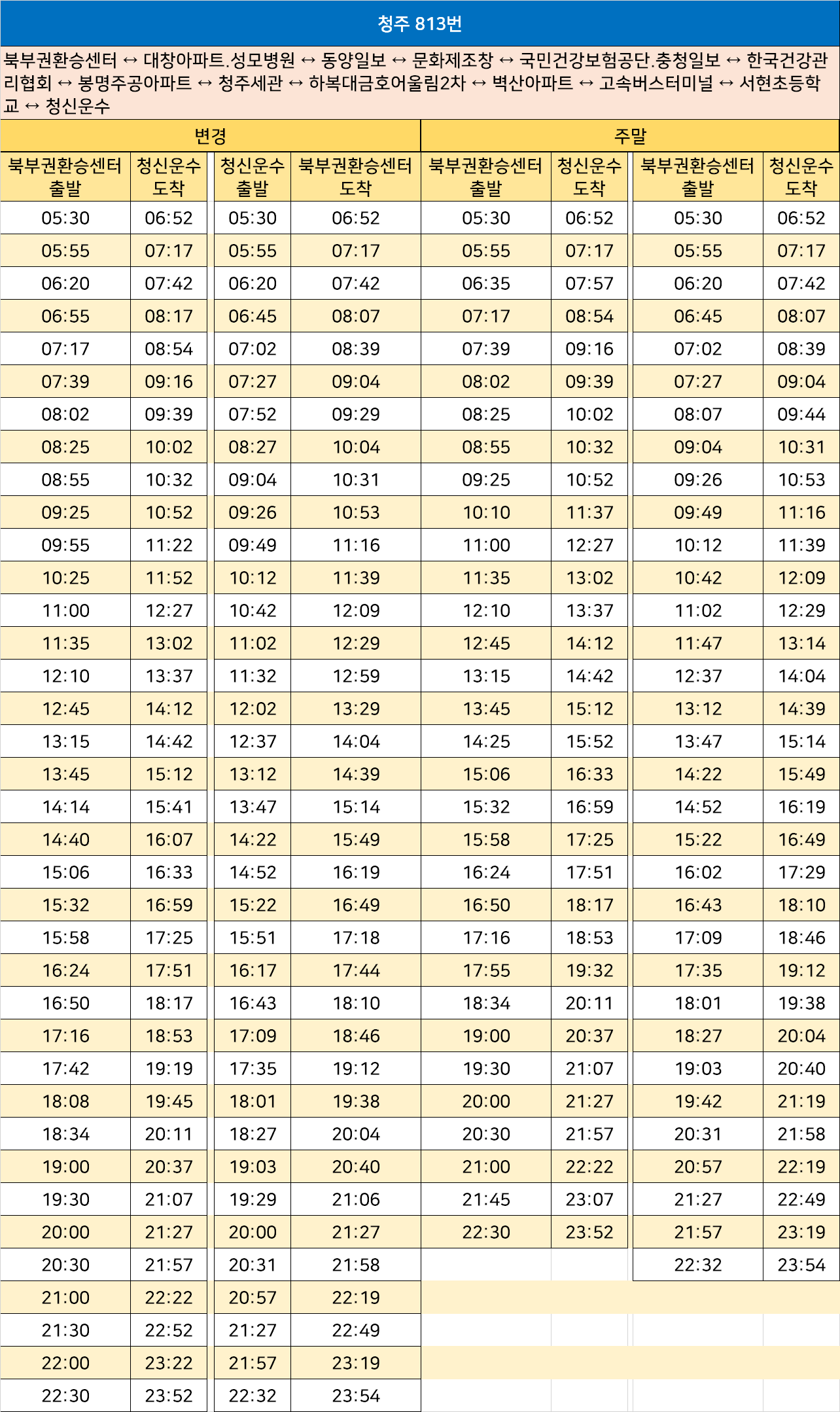 청주 813번: 북부권환승센터 ↔ 대창아파트.성모병원 ↔ 동양일보 ↔ 문화제조창 ↔ 국민건강보험공단.충청일보 ↔ 한국건강관리협회 ↔ 봉명주공아파트 ↔ 청주세관 ↔ 하복대금호어울림2차 ↔ 벽산아파트 ↔ 고속버스터미널 ↔ 서현초등학교 ↔ 청신운수
