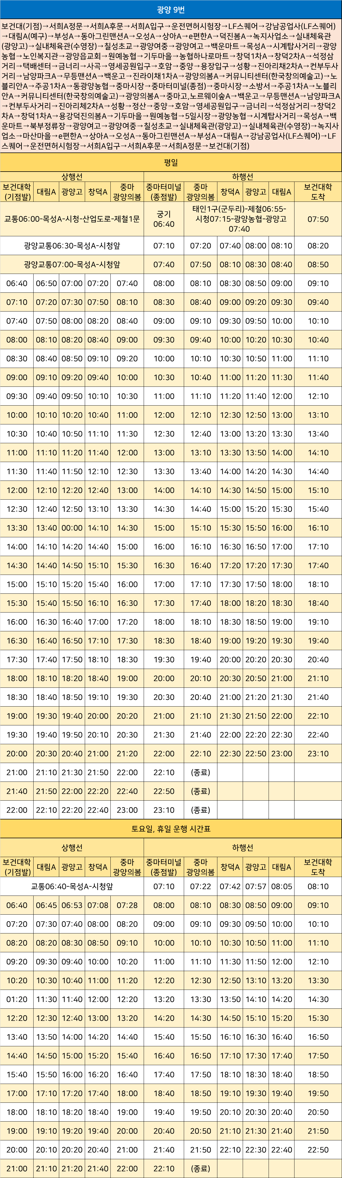 광양 9번: 보건대(기점)↔서희A정문↔서희A후문↔서희A입구↔운전면허시험장↔LF스퀘어↔강남공업사(LF스퀘어)↔대림A(예구)↔부성A↔동아그린맨션A↔오성A↔상아A↔e편한A↔덕진봄A↔녹지사업소↔실내체육관(광양고)↔실내체육관(수영장)↔칠성초교↔광양여중↔광양여고↔백운마트↔목성A↔시계탑사거리↔광양농협↔노인복지관↔광양읍교회↔원예농협↔기두마을↔농협하나로마트↔창덕1차A↔창덕2차A↔석정삼거리↔택배센터↔금너리↔사곡↔영세공원입구↔호암↔중양↔용장입구↔성황↔진아리채2차A↔컨부두사거리↔남양파크A↔무등맨션A↔백운고↔진라이채1차A↔광양의봄A↔커뮤니티센터(한국창의예술고)↔노블리안A↔주공1차A↔동광양농협↔중마시장↔중마터미널(종점)↔중마시장↔소방서↔주공1차A↔노블리안A↔커뮤니티센터(한국창의예술고)↔광양의봄A↔중마고,노르웨이숲A↔백운고↔무등맨션A↔남양파크A↔컨부두사거리↔진아리체2차A↔성황↔정산↔중양↔호암↔영세공원입구↔금너리↔석정삼거리↔창덕2차A↔창덕1차A↔용강덕진의봄A↔기두마을↔원예농협↔5일시장↔광양농협↔시계탑사거리↔목성A↔백운마트↔북부정류장↔광양여고↔광양여중↔칠성초교↔실내체육관(광양고)↔실내체육관(수영장)↔녹지사업소↔마산마을↔e편한A↔상아A↔오성A↔동아그린맨션A↔부성A↔대림A↔강남공업사(LF스퀘어)↔LF스퀘어↔운전면허시험장↔서희A입구↔서희A후문↔서희A정문↔보건대(기점)