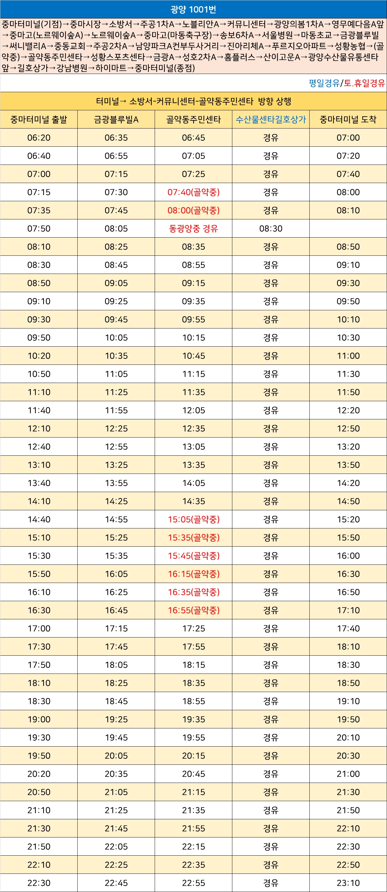 광양 1001번: 중마터미널(기점)→중마시장→소방서→주공1차A→노블리안A→커뮤니센터→광양의봄1차A→영무예다음A앞→중마고(노르웨이숲A)→노르웨이숲A→중마고(마동축구장)→송보6차A→서울병원→마동초교→금광블루빌→써니밸리A→중동교회→주공2차A→남양파크A컨부두사거리→진아리체A→푸르지오아파트→성황농협→(골약중)→골약동주민센타→성황스포츠센타→금광A→성호2차A→홈플러스→산이고운A→광양수산물유통센타앞→길호상가→강남병원→하이마트→중마터미널(종점)