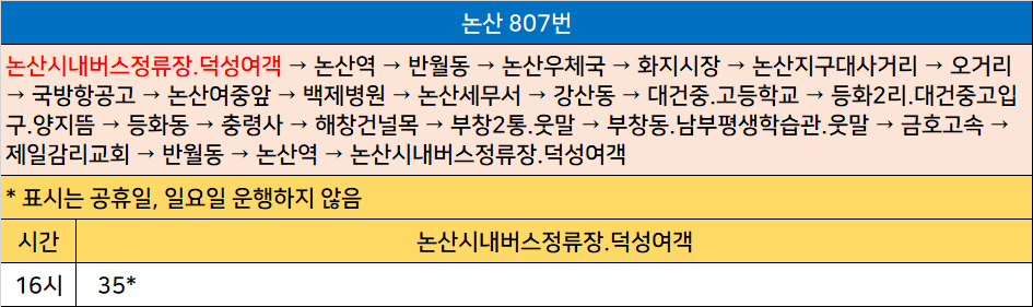 논산 807번: 논산시내버스정류장.덕성여객 → 논산역 → 반월동 → 논산우체국 → 화지시장 → 논산지구대사거리 → 오거리 → 국방항공고 → 논산여중앞 → 백제병원 → 논산세무서 → 강산동 → 대건중.고등학교 → 등화2리.대건중고입구.양지뜸 → 등화동 → 충령사 → 해창건널목 → 부창2통.웃말 → 부창동.남부평생학습관.웃말 → 금호고속 → 제일감리교회 → 반월동 → 논산역 → 논산시내버스정류장.덕성여객