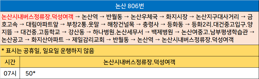 논산 806번: 논산시내버스정류장.덕성여객 → 논산역 → 반월동 → 논산우체국 → 화지시장 → 논산지구대사거리 → 금호고속 → 대림아파트앞 → 부창2통.웃말 → 해창건널목 → 충령사 → 등화동 → 등화2리.대건중고입구.양지뜸 → 대건중.고등학교 → 강산동 → 하나병원.논산세무서 → 백제병원 → 논산여중고.남부평생학습관 → 논산공고 → 화지산아파트 → 제일감리교회 → 반월동 → 논산역 → 논산시내버스정류장.덕성여객