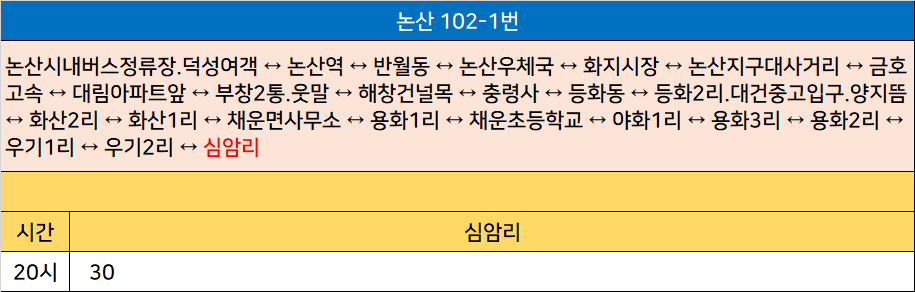 논산 102-1번: 논산시내버스정류장.덕성여객 ↔ 논산역 ↔ 반월동 ↔ 논산우체국 ↔ 화지시장 ↔ 논산지구대사거리 ↔ 금호고속 ↔ 대림아파트앞 ↔ 부창2통.웃말 ↔ 해창건널목 ↔ 충령사 ↔ 등화동 ↔ 등화2리.대건중고입구.양지뜸 ↔ 화산2리 ↔ 화산1리 ↔ 채운면사무소 ↔ 용화1리 ↔ 채운초등학교 ↔ 야화1리 ↔ 용화3리 ↔ 용화2리 ↔ 우기1리 ↔ 우기2리 ↔ 심암리