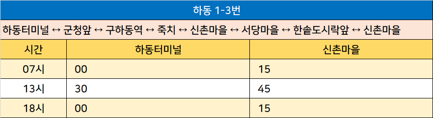 하동 1-3번: 하동터미널 ↔ 군청앞 ↔ 구하동역 ↔ 죽치 ↔ 신촌마을 ↔ 서당마을 ↔ 한솥도시락앞 ↔ 신촌마을