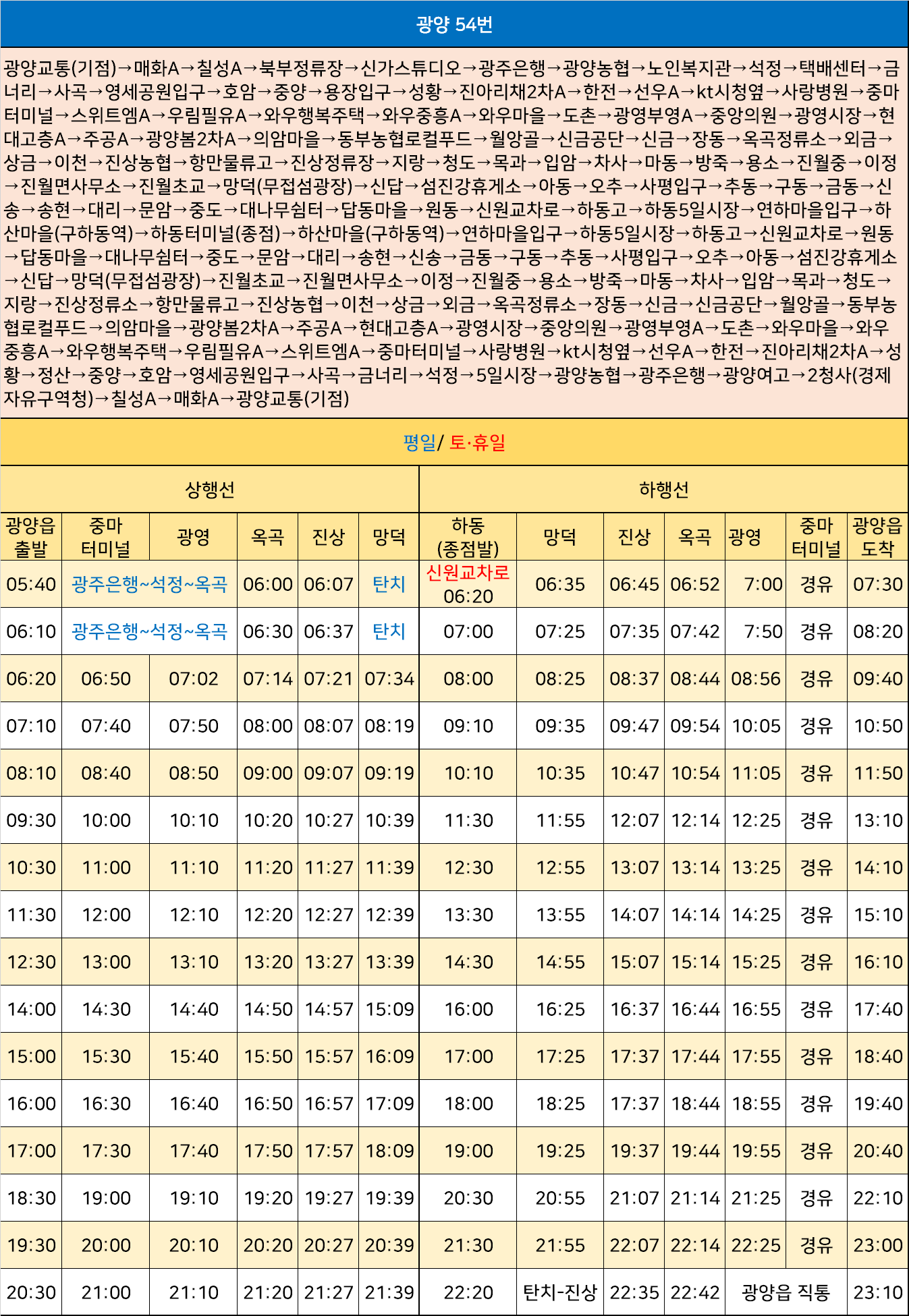 광양 54번: 광양교통(기점)→매화A→칠성A→북부정류장→신가스튜디오→광주은행→광양농협→노인복지관→석정→택배센터→금너리→사곡→영세공원입구→호암→중양→용장입구→성황→진아리채2차A→한전→선우A→kt시청옆→사랑병원→중마터미널→스위트엠A→우림필유A→와우행복주택→와우중흥A→와우마을→도촌→광영부영A→중앙의원→광영시장→현대고층A→주공A→광양봄2차A→의암마을→동부농협로컬푸드→월앙골→신금공단→신금→장동→옥곡정류소→외금→상금→이천→진상농협→항만물류고→진상정류장→지랑→청도→목과→입암→차사→마동→방죽→용소→진월중→이정→진월면사무소→진월초교→망덕(무접섬광장)→신답→섬진강휴게소→아동→오추→사평입구→추동→구동→금동→신송→송현→대리→문암→중도→대나무쉼터→답동마을→원동→신원교차로→하동고→하동5일시장→연하마을입구→하산마을(구하동역)→하동터미널(종점)→하산마을(구하동역)→연하마을입구→하동5일시장→하동고→신원교차로→원동→답동마을→대나무쉼터→중도→문암→대리→송현→신송→금동→구동→추동→사평입구→오추→아동→섬진강휴게소→신답→망덕(무접섬광장)→진월초교→진월면사무소→이정→진월중→용소→방죽→마동→차사→입암→목과→청도→지랑→진상정류소→항만물류고→진상농협→이천→상금→외금→옥곡정류소→장동→신금→신금공단→월앙골→동부농협로컬푸드→의암마을→광양봄2차A→주공A→현대고층A→광영시장→중앙의원→광영부영A→도촌→와우마을→와우중흥A→와우행복주택→우림필유A→스위트엠A→중마터미널→사랑병원→kt시청옆→선우A→한전→진아리채2차A→성황→정산→중양→호암→영세공원입구→사곡→금너리→석정→5일시장→광양농협→광주은행→광양여고→2청사(경제자유구역청)→칠성A→매화A→광양교통(기점)