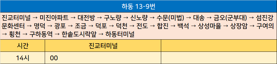 하동 13-9번: 진교터미널 → 미진아파트 → 대전방 → 구노량 → 신노량 → 수문(미법) → 대송 → 금오(군부대) → 섬진강문화센터 → 명덕 → 광포 → 조금 → 덕포 → 덕천 → 전도 → 합진 → 백석 → 상성마을 → 상장암 → 구여의 → 횡천 → 구하동역 → 한솥도시락앞 → 하동터미널