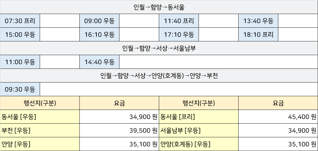 마천시외고속버스터미널 마천정류장 마천정류소 → "인월→함양→동서울,인월→함양→서상→서울남부,인월→함양→서상→호계동→안양→부천".