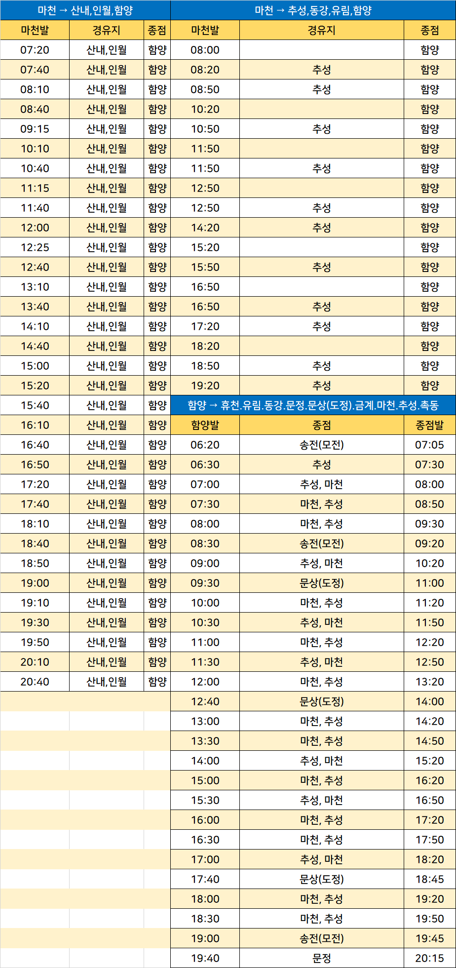 마천 터미널 일반 시외버스 시간표 - 함양군청 자료