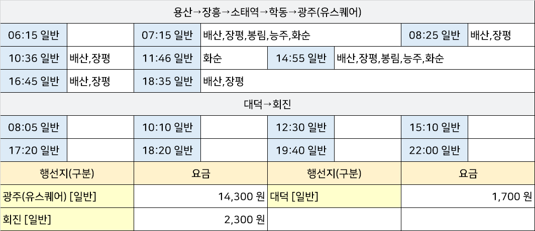 관산시외고속버스터미널 관산정류장 관산정류소 → "능주,대덕→회진,배산,봉림,용산→장흥→소태역→학동→광주(유스퀘어),장평,화순".