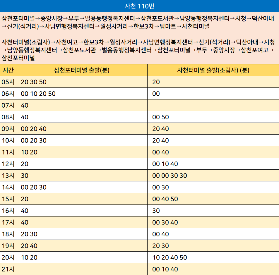 사천 110번: 삼천포터미널→중앙시장→부두→벌용동행정복지센터→삼천포도서관→남양동행정복지센터→시청→덕산아내→신기(석거리)→사남면행정복지센터→월성사거리→한보3차→탑마트→사천터미널 / 사천터미널(소림사)→사천여고→한보3차→월성사거리→사남면행정복지센터→신기(석거리)→덕산아내→시청→남양동행정복지센터→삼천포도서관→벌용동행정복지센터→삼천포터미널→부두→중앙시장→삼천포여고→삼천포터미널