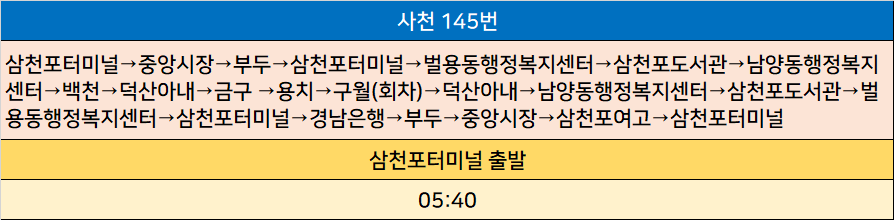 사천 145번: 삼천포터미널→중앙시장→부두→삼천포터미널→벌용동행정복지센터→삼천포도서관→남양동행정복지센터→백천→덕산아내→금구 →용치→구월(회차)→덕산아내→남양동행정복지센터→삼천포도서관→벌용동행정복지센터→삼천포터미널→경남은행→부두→중앙시장→삼천포여고→삼천포터미널