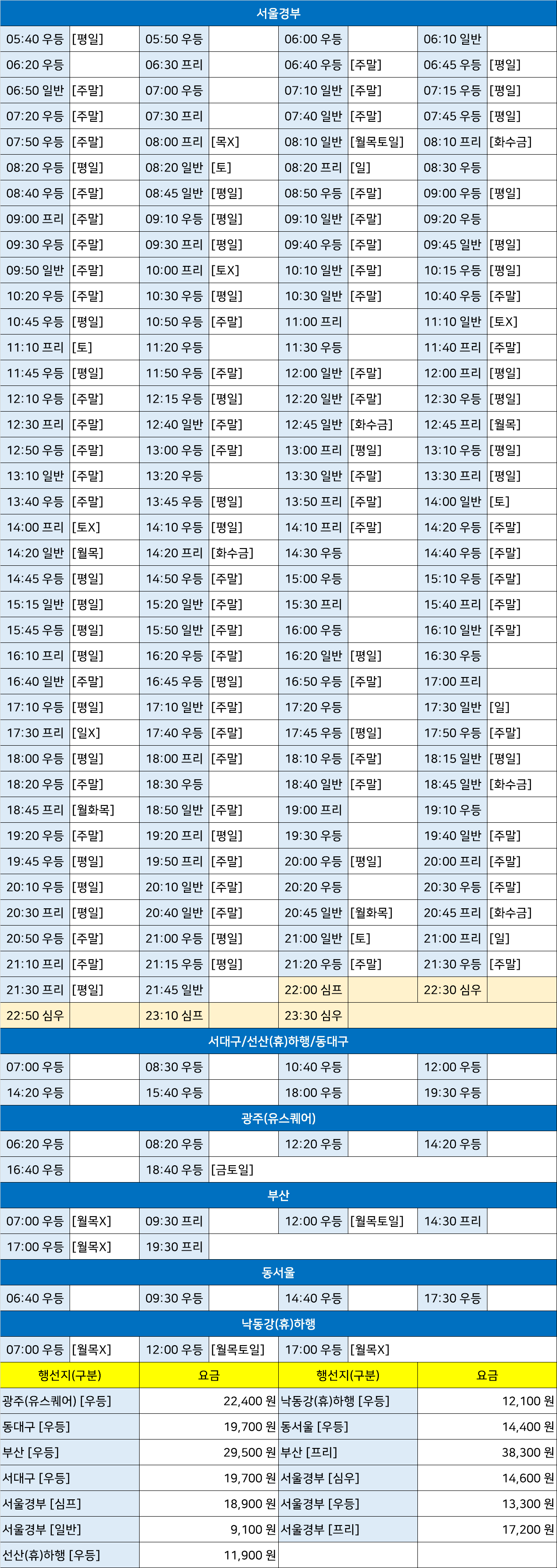 청주고속버스임시터미널 청주고속터미널 → "광주(유스퀘어),낙동강(휴)하행,동대구,동서울,부산,서대구,서울경부,선산(휴)하행".