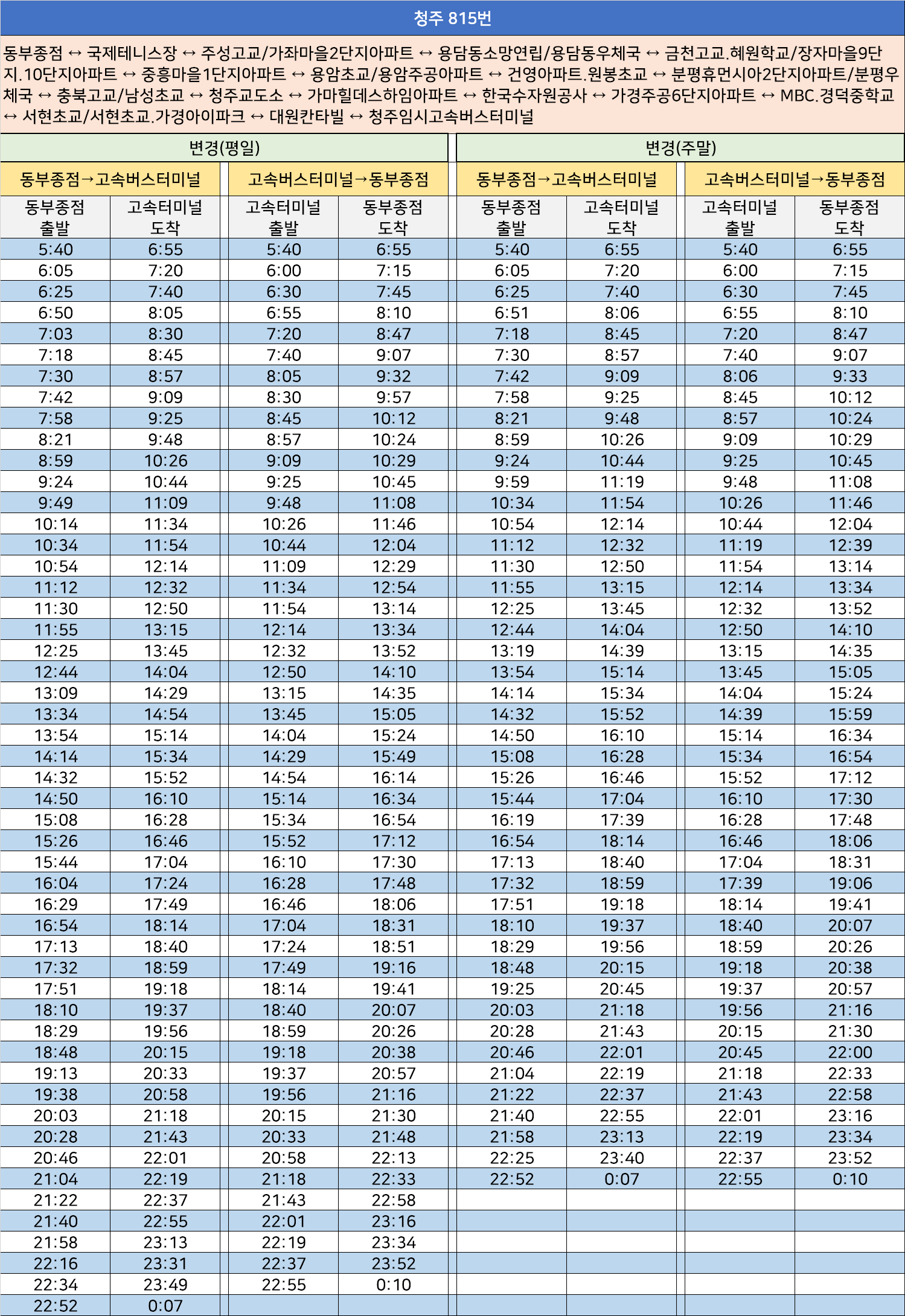 청주 815번: 동부종점 ↔ 국제테니스장 ↔ 주성고교/가좌마을2단지아파트 ↔ 용담동소망연립/용담동우체국 ↔ 금천고교.혜원학교/장자마을9단지.10단지아파트 ↔ 중흥마을1단지아파트 ↔ 용암초교/용암주공아파트 ↔ 건영아파트.원봉초교 ↔ 분평휴먼시아2단지아파트/분평우체국 ↔ 충북고교/남성초교 ↔ 청주교도소 ↔ 가마힐데스하임아파트 ↔ 한국수자원공사 ↔ 가경주공6단지아파트 ↔ MBC.경덕중학교 ↔ 서현초교/서현초교.가경아이파크 ↔ 대원칸타빌 ↔ 청주임시고속버스터미널