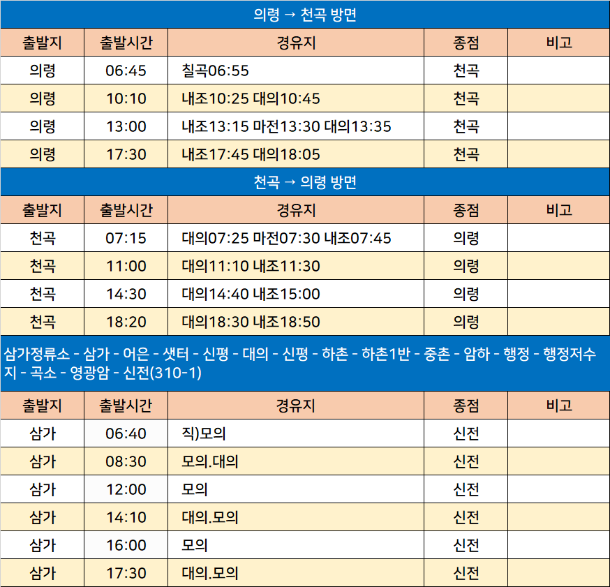 대의 방면 농어촌버스 노선정보: 칠삼가정류소 - 삼가 - 어은 - 샛터 - 신평 - 대의 - 신평 - 하촌 - 하촌1반 - 중촌 - 암하 - 행정 - 행정저수지 - 곡소 - 영광암 - 신전, 곡, 내조, 대의, 마전, 천곡, 의령