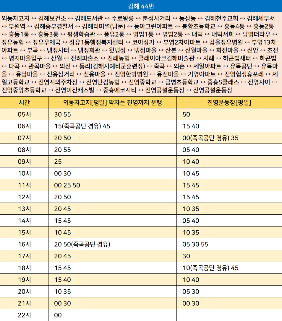 김해 44번: 외동차고지 ↔ 김해보건소 ↔ 김해도서관 ↔ 수로왕릉 ↔ 분성사거리 ↔ 동상동 ↔ 김해천주교회 ↔ 김해세무서 ↔ 부원역 ↔ 김해중부경찰서 ↔ 김해터미널(남문) ↔ 동아그린아파트 ↔ 봉황초등학교 ↔ 흥동4통 ↔ 흥동2통 ↔ 흥동1통 ↔ 흥동3통 ↔ 평생학습관 ↔ 풍유2통 ↔ 명법1통 ↔ 명법2통 ↔ 내덕 ↔ 내덕서희 ↔ 남명더라우 ↔ 장유농협 ↔ 장유우체국 ↔ 장유1동행정복지센터 ↔ 코아상가 ↔ 부영2차아파트 ↔ 갑을장유병원 ↔ 부영13차아파트 ↔ 부곡 ↔ 냉정사터 ↔ 냉정회관 ↔ 윗냉정 ↔ 냉정마을 ↔ 산본 ↔ 신월마을 ↔ 화전마을 ↔ 신안 ↔ 초전 ↔ 평지마을입구 ↔ 산월 ↔ 진례파출소 ↔ 진례농협 ↔ 클레이아크김해미술관 ↔ 시례 ↔ 하곤법새터 ↔ 하곤법 ↔ 다곡 ↔ 관곡마을 ↔ 의전 ↔ 등리(김해시예비군훈련장) ↔ 죽곡 ↔ 외촌 ↔ 세일아파트 ↔ 유목공단 ↔ 유목마을 ↔ 용담마을 ↔ 신용삼거리 ↔ 신용마을 ↔ 진영한방병원 ↔ 용전마을 ↔ 기영아파트 ↔ 진영협성휴포레 ↔ 제일고등학교 ↔ 진영시외주차장 ↔ 진영단감농협 ↔ 진영중학교 ↔ 금병초등학교 ↔ 중흥S클래스 ↔ 진영자이 ↔ 진영중앙초등학교 ↔ 진영이진캐스빌 ↔ 중흥에코시티 ↔ 진영공설운동장 ↔ 진영공설운동장