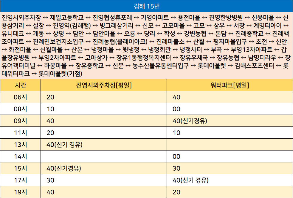 김해 15번: 진영시외주차장 ↔ 제일고등학교 ↔ 진영협성휴포레 ↔ 기영아파트 ↔ 용전마을 ↔ 진영한방병원 ↔ 신용마을 ↔ 신용삼거리 ↔ 설창 ↔ 진영역(김해행) ↔ 빙그레삼거리 ↔ 신모 ↔ 고모마을 ↔ 고모 ↔ 상우 ↔ 서창 ↔ 계명티아이 ↔ 유니테크 ↔ 개동 ↔ 상평 ↔ 담안 ↔ 담안마을 ↔ 오룡 ↔ 당리 ↔ 학성 ↔ 강변농협 ↔ 돈담 ↔ 진례중학교 ↔ 진례백조아파트 ↔ 진례면보건지소입구 ↔ 진례농협(클레이아크) ↔ 진례파출소 ↔ 산월 ↔ 평지마을입구 ↔ 초전 ↔ 신안 ↔ 화전마을 ↔ 신월마을 ↔ 산본 ↔ 냉정마을 ↔ 윗냉정 ↔ 냉정회관 ↔ 냉정사터 ↔ 부곡 ↔ 부영13차아파트 ↔ 갑을장유병원 ↔ 부영2차아파트 ↔ 코아상가 ↔ 장유1동행정복지센터 ↔ 장유우체국 ↔ 장유농협 ↔ 남명더라우 ↔ 장유여객터미널 ↔ 하봉마을 ↔ 장유중학교 ↔ 신문 ↔ 농수산물유통센터입구 ↔ 롯데아울렛 ↔ 김해스포츠센터 ↔ 롯데워터파크 ↔ 롯데아울렛(기점)