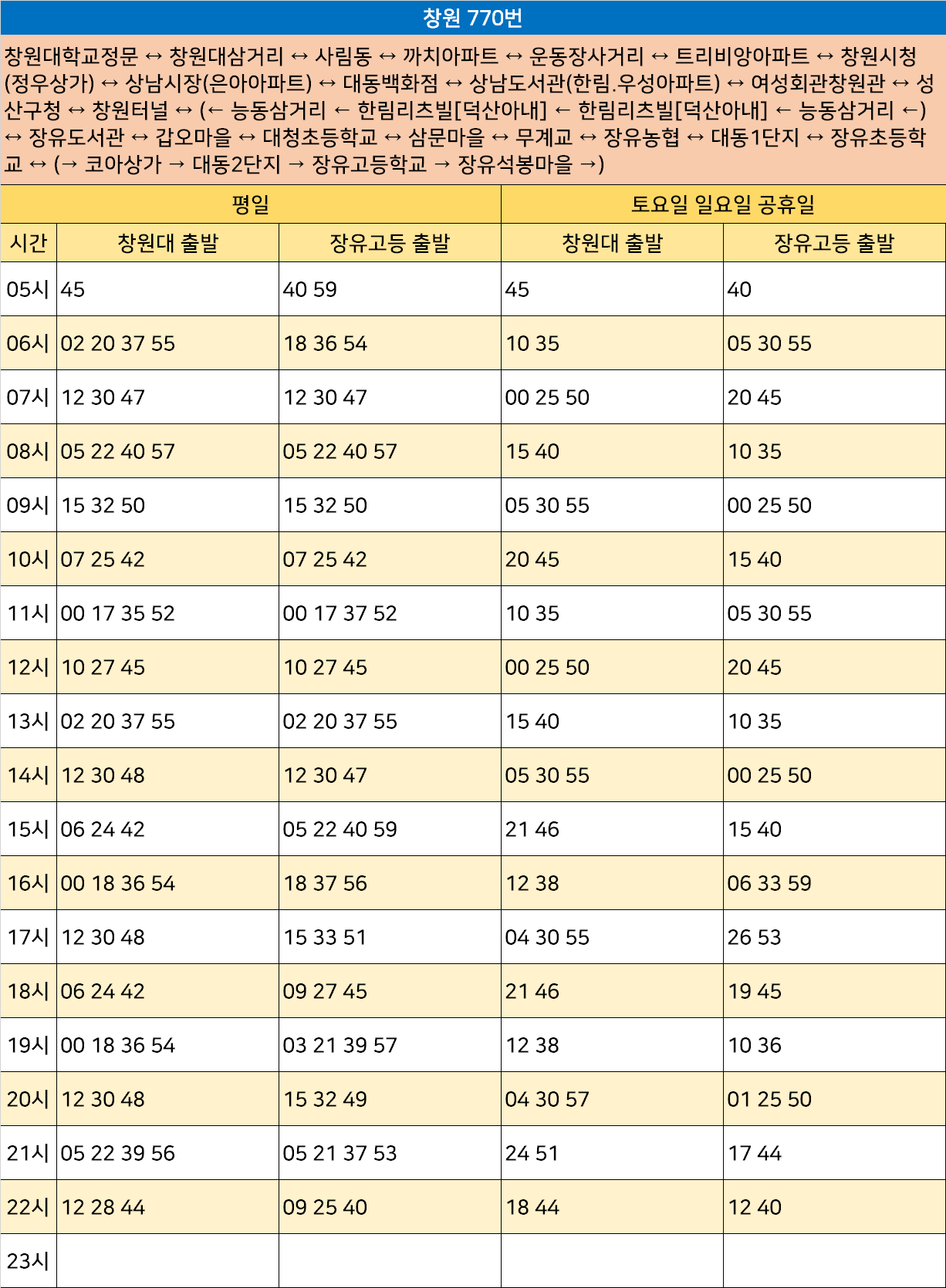 창원 770번: 창원대학교정문 ↔ 창원대삼거리 ↔ 사림동 ↔ 까치아파트 ↔ 운동장사거리 ↔ 트리비앙아파트 ↔ 창원시청(정우상가) ↔ 상남시장(은아아파트) ↔ 대동백화점 ↔ 상남도서관(한림.우성아파트) ↔ 여성회관창원관 ↔ 성산구청 ↔ 창원터널 ↔ (← 능동삼거리 ← 한림리츠빌[덕산아내] ← 한림리츠빌[덕산아내] ← 능동삼거리 ←) ↔ 장유도서관 ↔ 갑오마을 ↔ 대청초등학교 ↔ 삼문마을 ↔ 무계교 ↔ 장유농협 ↔ 대동1단지 ↔ 장유초등학교 ↔ (→ 코아상가 → 대동2단지 → 장유고등학교 → 장유석봉마을 →)