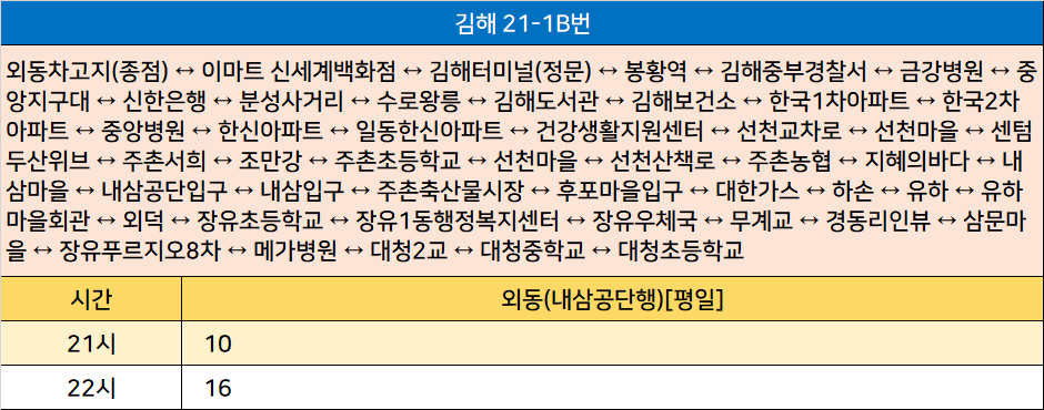 김해 21-1B번: 외동차고지(종점) ↔ 이마트 신세계백화점 ↔ 김해터미널(정문) ↔ 봉황역 ↔ 김해중부경찰서 ↔ 금강병원 ↔ 중앙지구대 ↔ 신한은행 ↔ 분성사거리 ↔ 수로왕릉 ↔ 김해도서관 ↔ 김해보건소 ↔ 한국1차아파트 ↔ 한국2차아파트 ↔ 중앙병원 ↔ 한신아파트 ↔ 일동한신아파트 ↔ 건강생활지원센터 ↔ 선천교차로 ↔ 선천마을 ↔ 센텀두산위브 ↔ 주촌서희 ↔ 조만강 ↔ 주촌초등학교 ↔ 선천마을 ↔ 선천산책로 ↔ 주촌농협 ↔ 지혜의바다 ↔ 내삼마을 ↔ 내삼공단입구 ↔ 내삼입구 ↔ 주촌축산물시장 ↔ 후포마을입구 ↔ 대한가스 ↔ 하손 ↔ 유하 ↔ 유하마을회관 ↔ 외덕 ↔ 장유초등학교 ↔ 장유1동행정복지센터 ↔ 장유우체국 ↔ 무계교 ↔ 경동리인뷰 ↔ 삼문마을 ↔ 장유푸르지오8차 ↔ 메가병원 ↔ 대청2교 ↔ 대청중학교 ↔ 대청초등학교