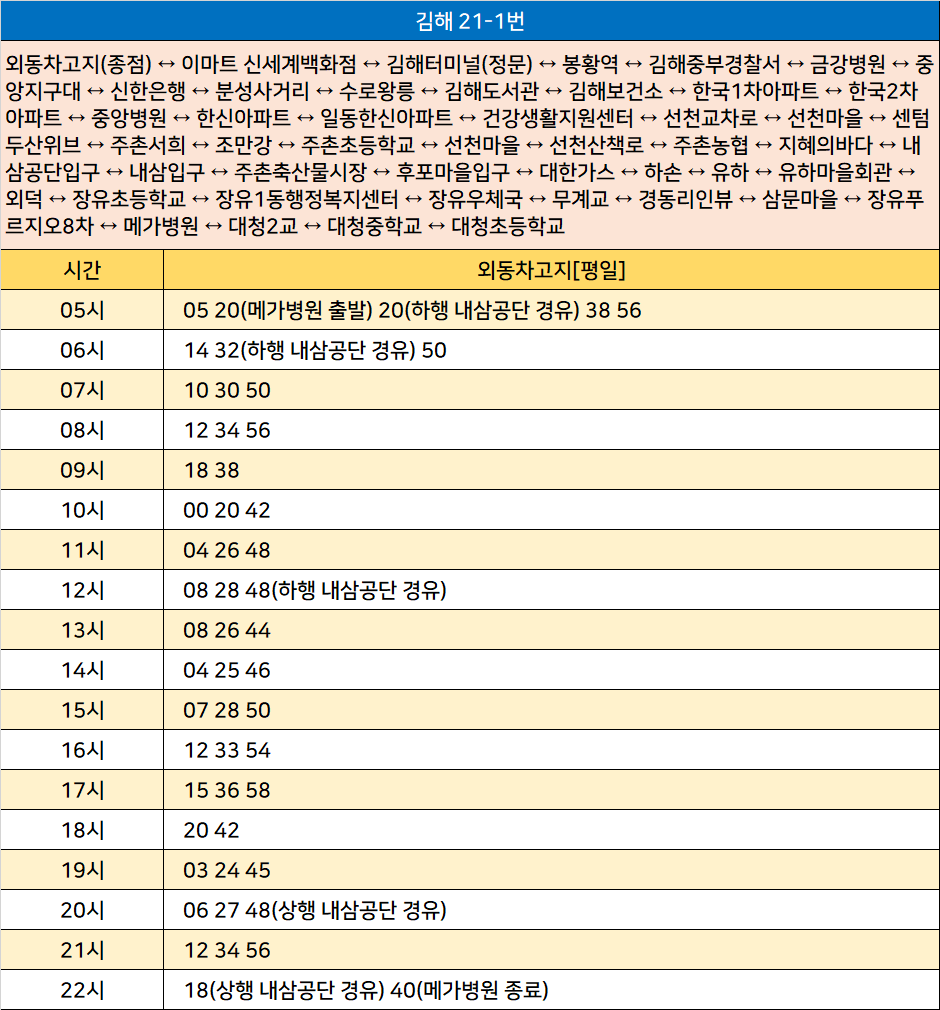 김해 21-1번: 외동차고지(종점) ↔ 이마트 신세계백화점 ↔ 김해터미널(정문) ↔ 봉황역 ↔ 김해중부경찰서 ↔ 금강병원 ↔ 중앙지구대 ↔ 신한은행 ↔ 분성사거리 ↔ 수로왕릉 ↔ 김해도서관 ↔ 김해보건소 ↔ 한국1차아파트 ↔ 한국2차아파트 ↔ 중앙병원 ↔ 한신아파트 ↔ 일동한신아파트 ↔ 건강생활지원센터 ↔ 선천교차로 ↔ 선천마을 ↔ 센텀두산위브 ↔ 주촌서희 ↔ 조만강 ↔ 주촌초등학교 ↔ 선천마을 ↔ 선천산책로 ↔ 주촌농협 ↔ 지혜의바다 ↔ 내삼공단입구 ↔ 내삼입구 ↔ 주촌축산물시장 ↔ 후포마을입구 ↔ 대한가스 ↔ 하손 ↔ 유하 ↔ 유하마을회관 ↔ 외덕 ↔ 장유초등학교 ↔ 장유1동행정복지센터 ↔ 장유우체국 ↔ 무계교 ↔ 경동리인뷰 ↔ 삼문마을 ↔ 장유푸르지오8차 ↔ 메가병원 ↔ 대청2교 ↔ 대청중학교 ↔ 대청초등학교