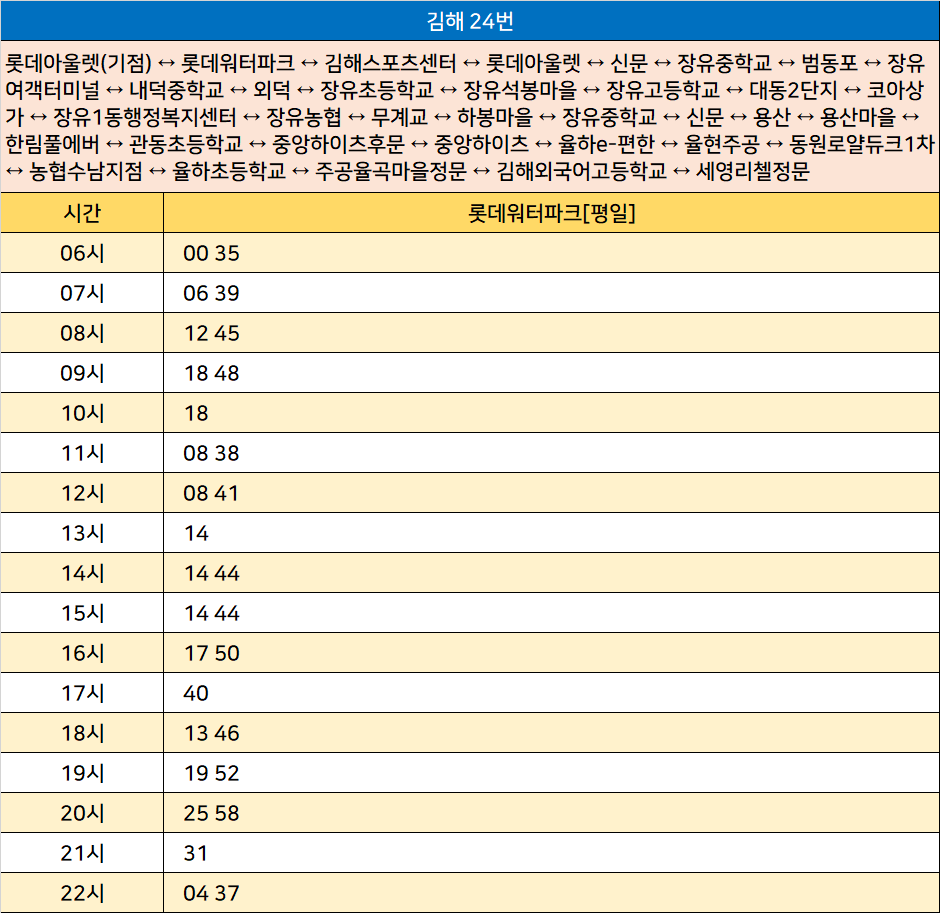 김해 24번: 롯데아울렛(기점) ↔ 롯데워터파크 ↔ 김해스포츠센터 ↔ 롯데아울렛 ↔ 신문 ↔ 장유중학교 ↔ 범동포 ↔ 장유여객터미널 ↔ 내덕중학교 ↔ 외덕 ↔ 장유초등학교 ↔ 장유석봉마을 ↔ 장유고등학교 ↔ 대동2단지 ↔ 코아상가 ↔ 장유1동행정복지센터 ↔ 장유농협 ↔ 무계교 ↔ 하봉마을 ↔ 장유중학교 ↔ 신문 ↔ 용산 ↔ 용산마을 ↔ 한림풀에버 ↔ 관동초등학교 ↔ 중앙하이츠후문 ↔ 중앙하이츠 ↔ 율하e-편한 ↔ 율현주공 ↔ 동원로얄듀크1차 ↔ 농협수남지점 ↔ 율하초등학교 ↔ 주공율곡마을정문 ↔ 김해외국어고등학교 ↔ 세영리첼정문