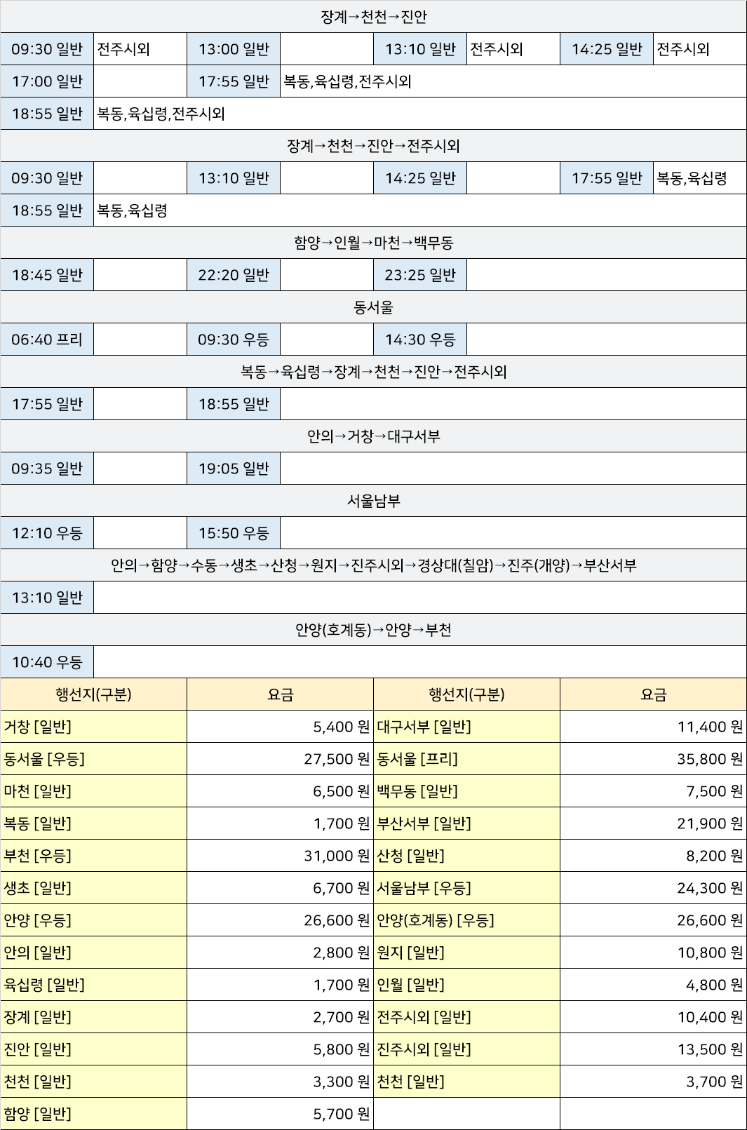 서상 시외버스 터미널 시간표/요금표 2025년 04월 19일 기준