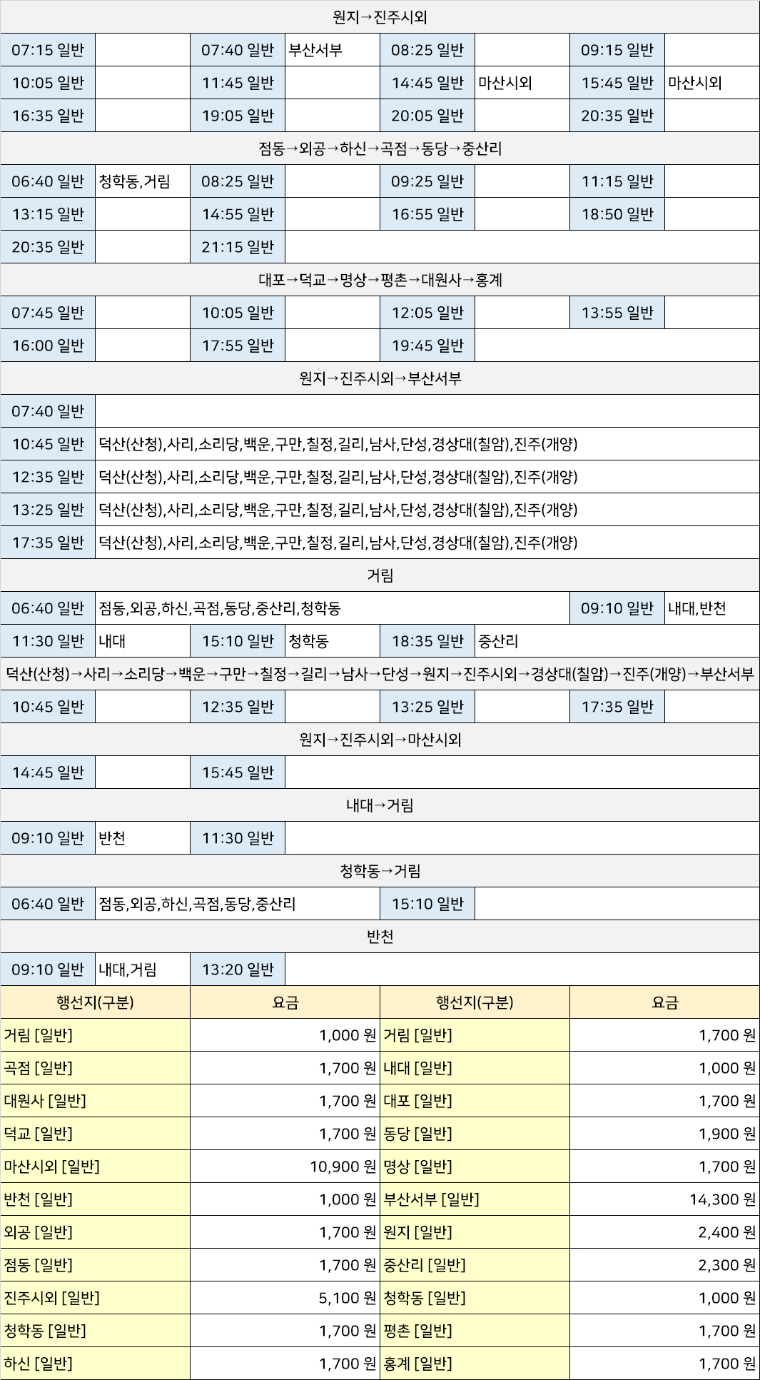 덕산농협 산청 시외버스 정류장 시간표/요금표 2025년 05월 16일 기준